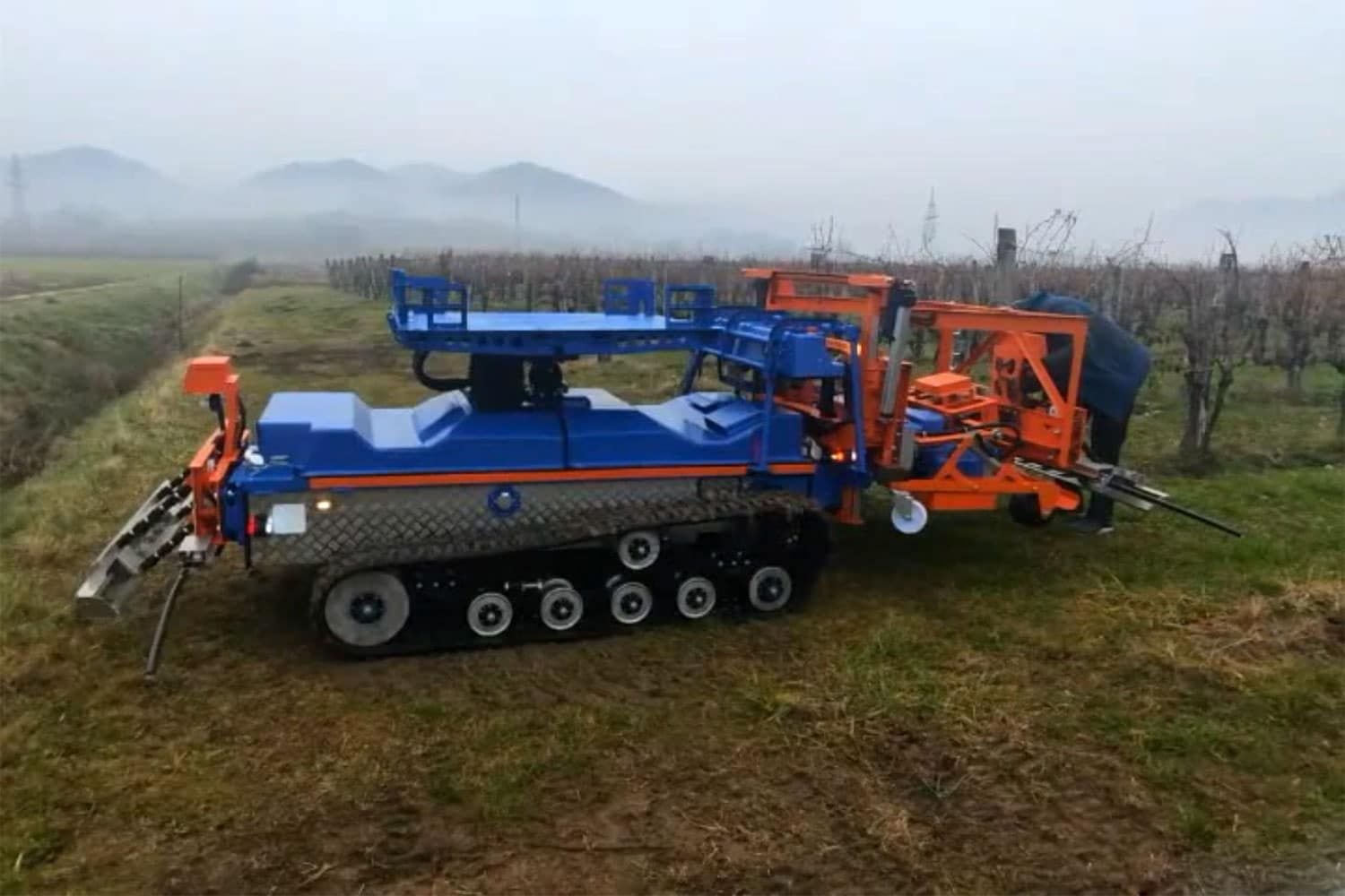 Then the autonomous Slopehelper robot moves across the field, completing its assigned task, automatically moving up one row, turning at the end, and then heading down the next one. It uses differential GNSS to maintain its position between rows and also uses touch sensors on both sides to determine the location of the vines’ trunks.