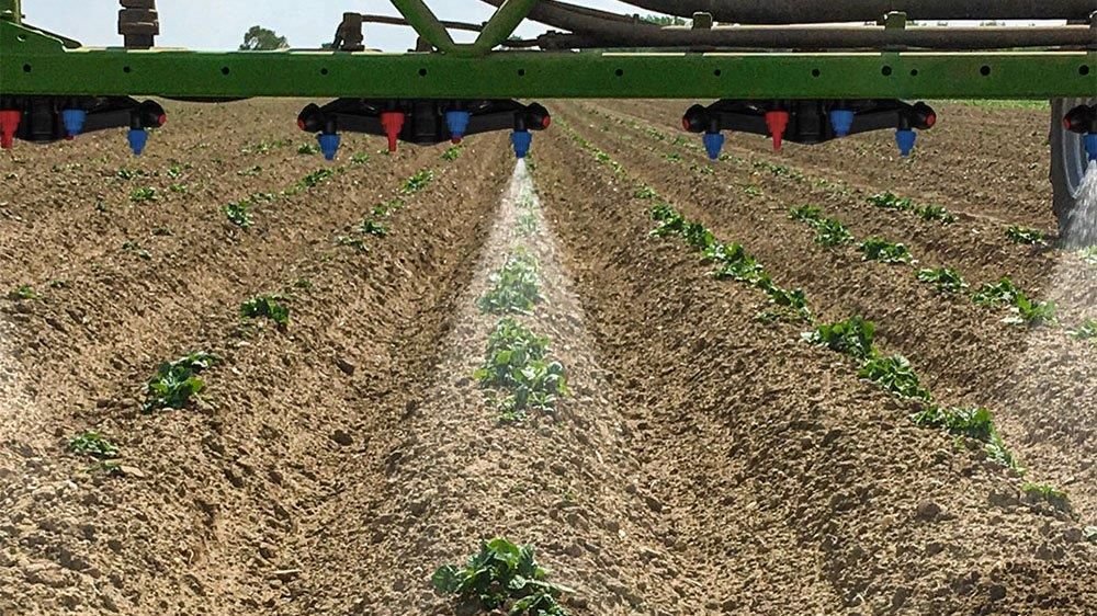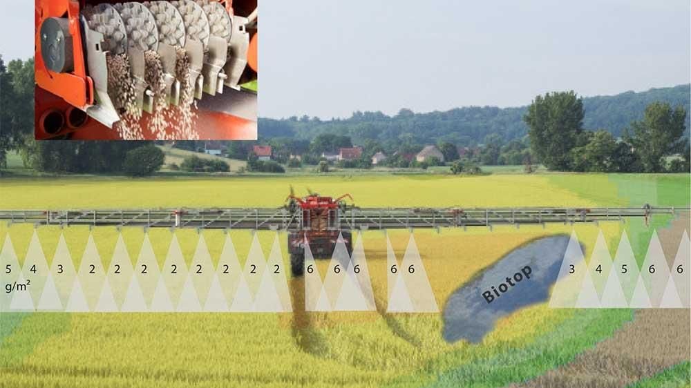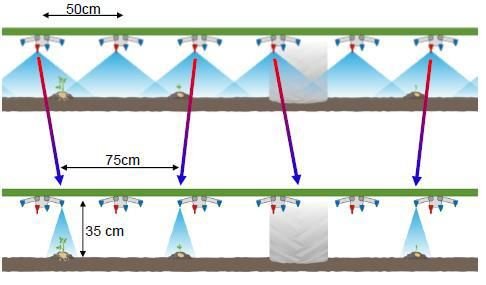 Bu yöntemle bir bant uygulaması için temel ön koşul, elbette, zaten ekimde RTK (Real Time Kinematic) yönlendirmesi aracılığıyla kültür bitkisinin düzgün ekimi ve ayrıca doğru bir izlemedir. Ayrıca, püskürtme açısının ve zeminden mesafenin iyi bir uyumlandırılması sonucu püskürtme bandının genişliğinin belirleyici olması nedeniyle optimum püskürtme rampası konumlandırması öngörülmektedir. Elbette rampa yüksekliğine bağlı olarak değişebileceği bilinerek, yerden 35 cm yükseklikte 40°lik püskürtme açısına sahip özel memeler kullanıldığında 25 cm’lik bir püskürtme genişliği elde edilmektedir.