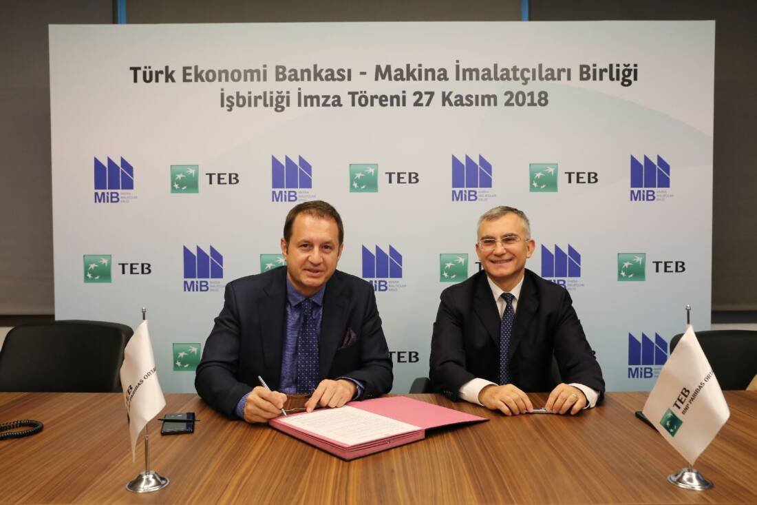 Türk Ekonomi Bankası ile Makina İmalatçıları Birliği, 27 Kasım Salı günü gerçekleşen imza töreniyle bir iş birliği anlaşması yaptı. TEB KOBİ Bankacılığı Kıdemli Genel Müdür Yardımcısı ve Genel Müdür Vekili Turgut Boz ile Makina İmalatçıları Birliği Başkanı Ahmet Özkayan’ın katılımıyla düzenlenen imza töreni ile yapılan anlaşma doğrultusunda teknoloji, girişimcilik ve üretim alanlarında ortak proje geliştirme, proje uygulama ve mentorluk programlarının yanı sıra MİB üyelerinin ihtiyaçlarına özel olarak TEB tarafından finansal hizmet ve ürünler de sağlanması öngörülüyor.